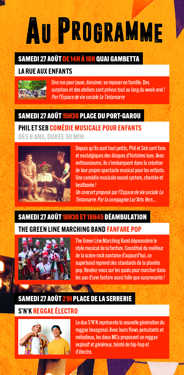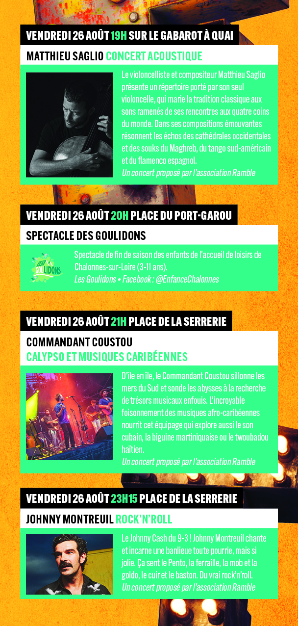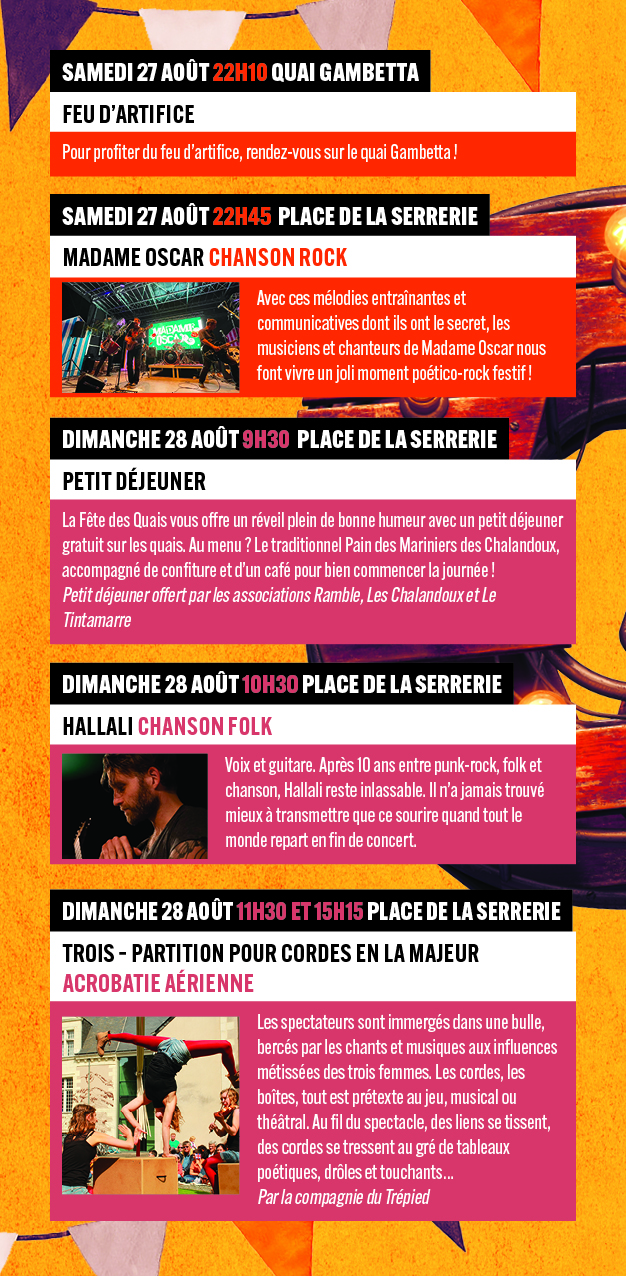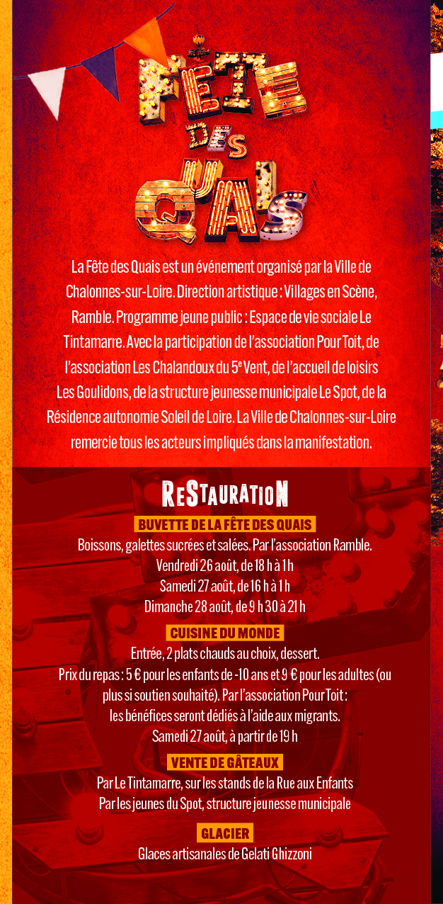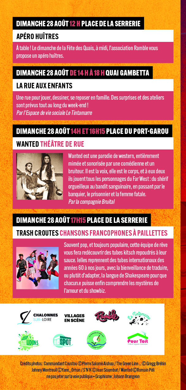 Trois jours de fête et des spectacles de rue sur les quais de la Loire, en partenariat avec Villages en Scène, Ramble, Le Tintamarre, Les Chalandoux, Pour Toit, Les Goulidons, Le Spot et la Résidence Soleil de Loire.